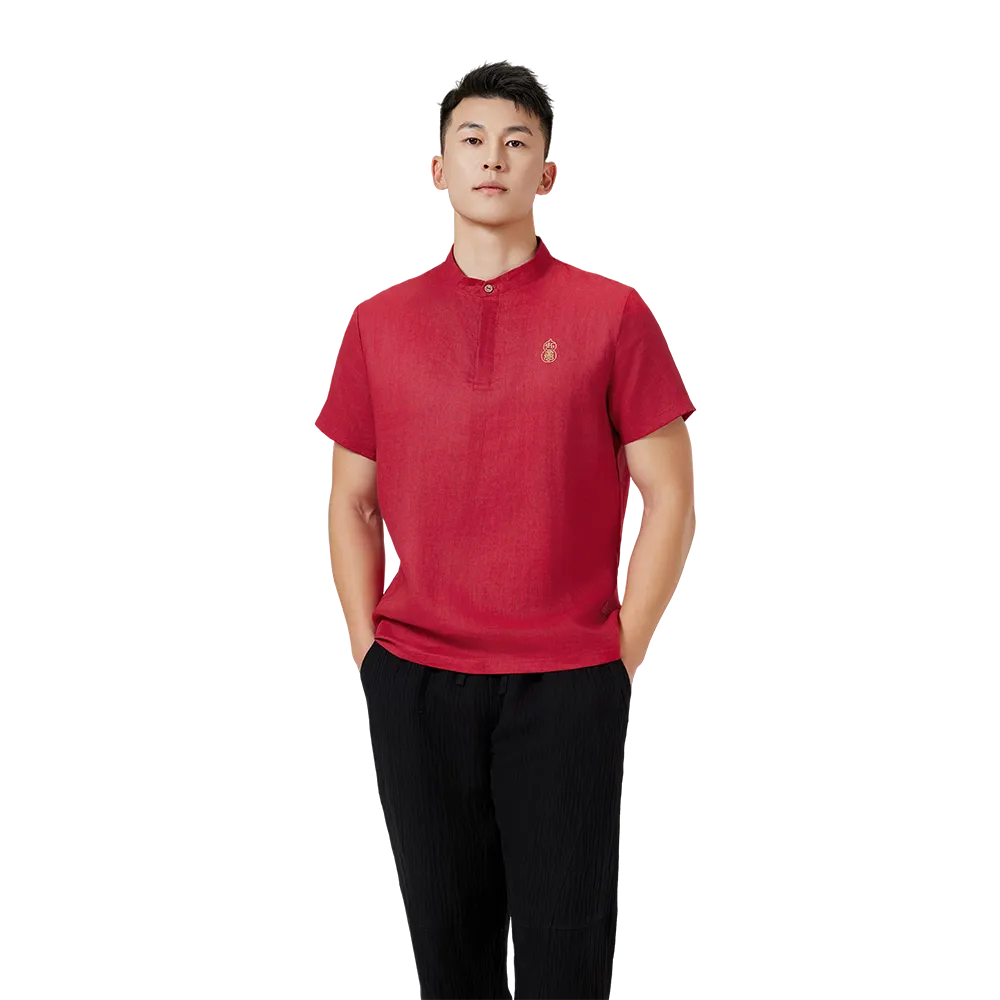 Channel the timeless fortune of elevated simplicity with our traditional Chinese men’s top. Made with a rich, auspicious red, this 100% pure linen lightweight Chinese top ensures your comfort. Breathable fabric with visible linen texture is soft to the touch while maintaining the structured Mandarin-style collar you want – with a single golden button closure. Ancient calligraphy is featured on the chest using raised golden embroidery for a final touch perfect for Chinese New Year celebrations or any smart casual occasion.